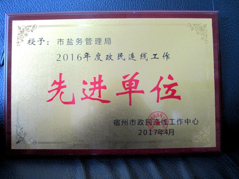 近日,宿州市政民連線工作中心通報表彰了2016年度全市政民連線工作先進單位和個人,宿州市鹽務局被授予“2016年度政民連線工作先進單位”稱號。