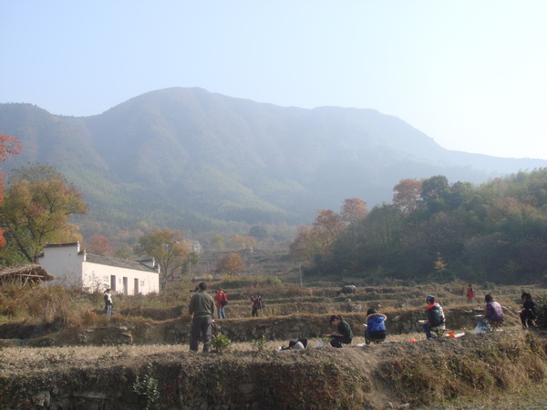 第二天清晨,我們坐上大客車開始期待中的旅程。出了屯溪不久就行駛在蜿蜒曲折的山間公路上,往往你覺得公路消失在前方的山腹里,一個(gè)90度的急轉(zhuǎn)彎又柳暗花明了。一個(gè)多小時(shí)后,客車徐徐的轉(zhuǎn)過一道彎,黟縣的同學(xué)說塔川到了,于是我們都昂起頭來到處張望,首先映入眼簾的不是風(fēng)景,而是公路邊架起的無數(shù)只“長(zhǎng)槍短炮”,那場(chǎng)面是絕對(duì)的震撼。哦,不,這本身就是一道風(fēng)景,一道能充分詮釋塔川之美的風(fēng)景。我順著那些鏡頭對(duì)著的方向看去,一大團(tuán)一大團(tuán)的色彩點(diǎn)綴在山谷中,有橘紅、有金黃、有絮白,似錦簇、似綢緞、似云霞,粉墻黛瓦的古民居點(diǎn)綴其中,青青淡淡的炊煙裊裊升騰,好一幅蕩氣回腸的秋色長(zhǎng)卷!