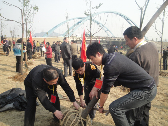 下午3點,黨員同志們打出志愿者旗幟,佩戴志愿者胸牌,自備勞動工具,來到吉慶廣場。他們有的挖坑、有的提水、有的抬樹苗,在采石河岸揮汗如雨。這次活動是市直工委今年組織的第一次大規模集中活動,勞動現場熱火朝天,很快一片志愿者林就初具規模。