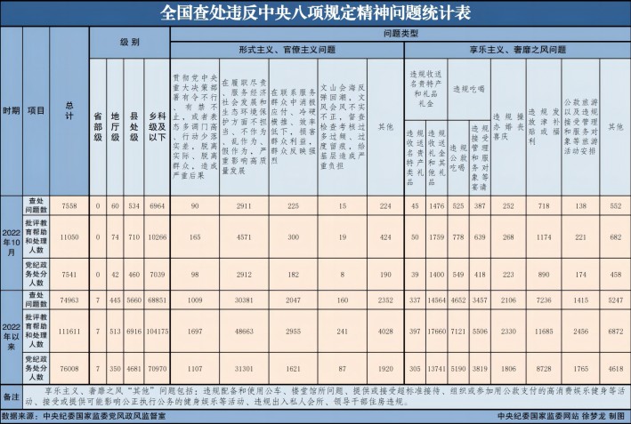 11月27日,中央紀委國家監委公布了2022年10月全國查處違反中央八項規定精神問題匯總情況。今年10月,全國共查處違反中央八項規定精神問題7558起,批評教育幫助和處理11050人,其中,黨紀政務處分7541人,這是連續第110個月公布月報數據。