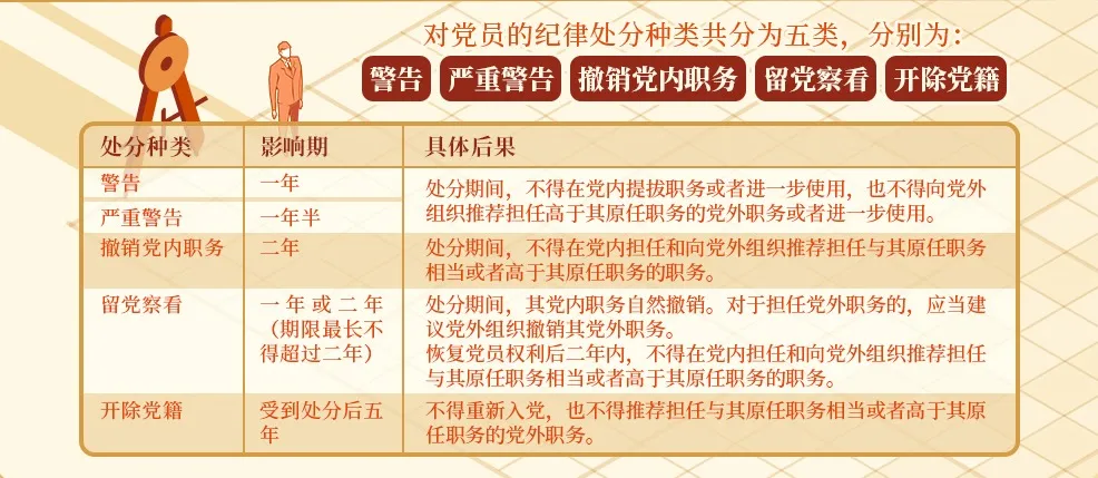《中國共產黨紀律處分條例》規定,對黨員的紀律處分種類共分為五類,分別為警告、嚴重警告、撤銷黨內職務、留黨察看和開除黨籍。