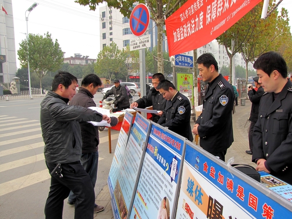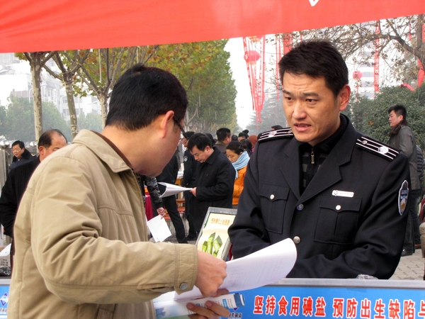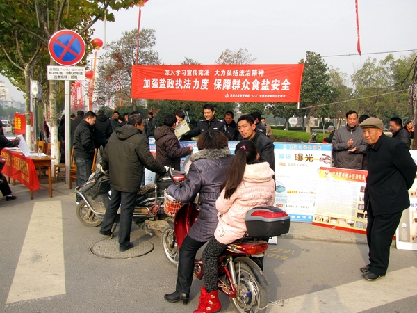 阜陽(yáng)市鹽務(wù)局高度重視此次宣傳活動(dòng),結(jié)合自身業(yè)務(wù)范疇,精心準(zhǔn)備大量法制宣傳資料。早晨7時(shí),天氣陰冷,寒風(fēng)勁吹,我局鹽政執(zhí)法人員在副局長(zhǎng)王道亞的帶領(lǐng)下,早早地布置好法制宣傳臺(tái)。在活動(dòng)現(xiàn)場(chǎng)王道亞親自向過往群眾宣傳鹽政法律法規(guī)知識(shí),宣傳消費(fèi)者、經(jīng)營(yíng)者的權(quán)利和義務(wù),宣傳消費(fèi)者如何依法維權(quán);進(jìn)行了假冒偽劣食鹽展示和鑒別;開展了涉鹽咨詢、受理投訴舉報(bào)。此次宣傳共發(fā)放宣傳資料500余份,接受群眾咨詢200余人次?;顒?dòng)現(xiàn)場(chǎng)布置了咨詢展臺(tái),擺放宣傳圖板10塊、宣傳展架3個(gè)、懸掛 2條生動(dòng)主題橫幅,展示了近期查獲的部分劣質(zhì)私鹽樣品,教市民辨別真假碘鹽的活動(dòng),咨詢臺(tái)前觀看宣傳圖版和前來咨詢的群眾絡(luò)繹不絕,受到了親自趕赴現(xiàn)場(chǎng)慰問的市人大常委副主任李新才、市政府副市長(zhǎng)黃珍、市政協(xié)副主席張永俠、市委宣傳部、市司法局和市依法治市領(lǐng)導(dǎo)小組辦公室有關(guān)領(lǐng)導(dǎo)以及廣大群眾的一致好評(píng)。