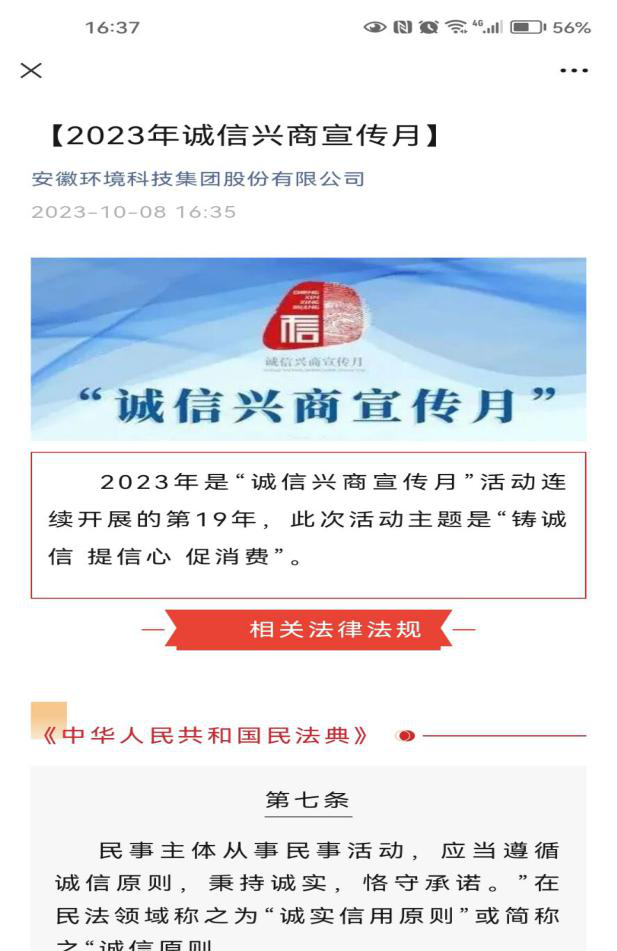 為進一步加強社會信用體系建設,弘揚誠信文化,引導企業(yè)增強誠信興商理念,樹牢誠實守信意識,省生態(tài)環(huán)境產業(yè)集團及各直屬(控股)公司開展“誠信興商”集中宣傳月活動。