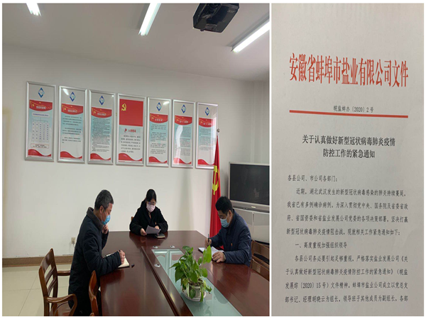 1月27日蚌埠鹽業公司黨總支召開了緊急會議,深入貫徹中央和上級黨委有關疫情防控的各項決策部署,制定了《關于認真做好新型冠狀病毒肺炎疫情防控工作的緊急通知》(皖鹽蚌辦〔2020〕2號)。成立了以黨總支書記、經理為組長,總支班子成員為副組長,各部門主要負責人為成員的新型冠狀病毒防控工作領導小組,要求市縣公司全方位積極做好疫情防控,立即啟動特殊時期食鹽供應緊急預案,市縣公司班子成員以及保障食鹽供應的相關業務崗位人員,要第一時間全部到崗就位,堅守疫情防控第一線,堅守食鹽保障供應第一線,實行24小時領導帶班值班制,抗疫情,保供應,眾志成城,義不容辭。