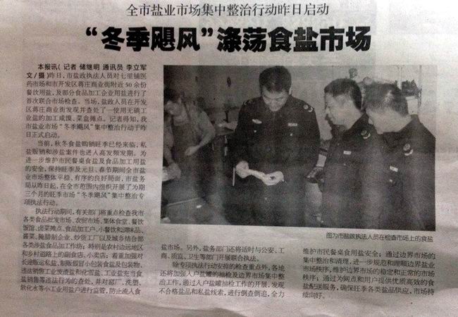 昨日,市鹽政執(zhí)法人員對(duì)七里鋪醫(yī)藥市場(chǎng)和市開(kāi)發(fā)區(qū)蔣莊商業(yè)街附近50余份餐飲用鹽,及部分食品加工企業(yè)用鹽進(jìn)行了首次聯(lián)合市場(chǎng)檢查。當(dāng)場(chǎng),鹽政人員在開(kāi)發(fā)區(qū)蔣莊商業(yè)街發(fā)現(xiàn)并查處了一使用無(wú)碘工業(yè)鹽的加工咸饃、菜盒攤點(diǎn)。記者得知,我市鹽業(yè)市場(chǎng)“冬季颶風(fēng)”集中整治行動(dòng)于昨日正式啟動(dòng)。