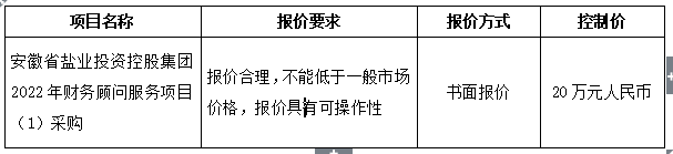 1.項(xiàng)目名稱:安徽省鹽業(yè)投資控股集團(tuán)2022年財務(wù)顧問服務(wù)項(xiàng)目(1)