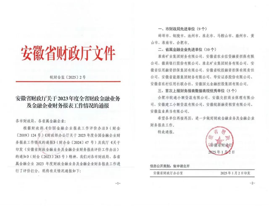 近日,安徽省財政廳依據(jù)《全國金融企業(yè)報表工作評價辦法》等相關文件精神,對各市財政局和省屬金融企業(yè)2023年度財政金融業(yè)務及金融企業(yè)財務報表工作進行了評價。徽鹽典當公司榮獲“首次上報財務報表數(shù)據(jù)表現(xiàn)優(yōu)秀單位”榮譽稱號。